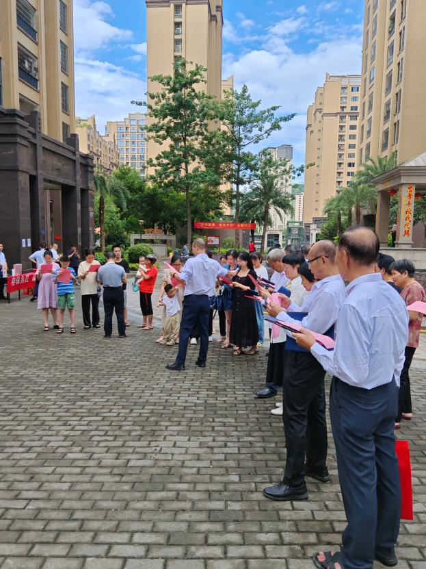 活动中,多方组成的朗诵队伍一起齐声朗读,声音震耳欲聋,响彻整个小区,由此表达出大家一起建设和谐美好社区的信心及决心。