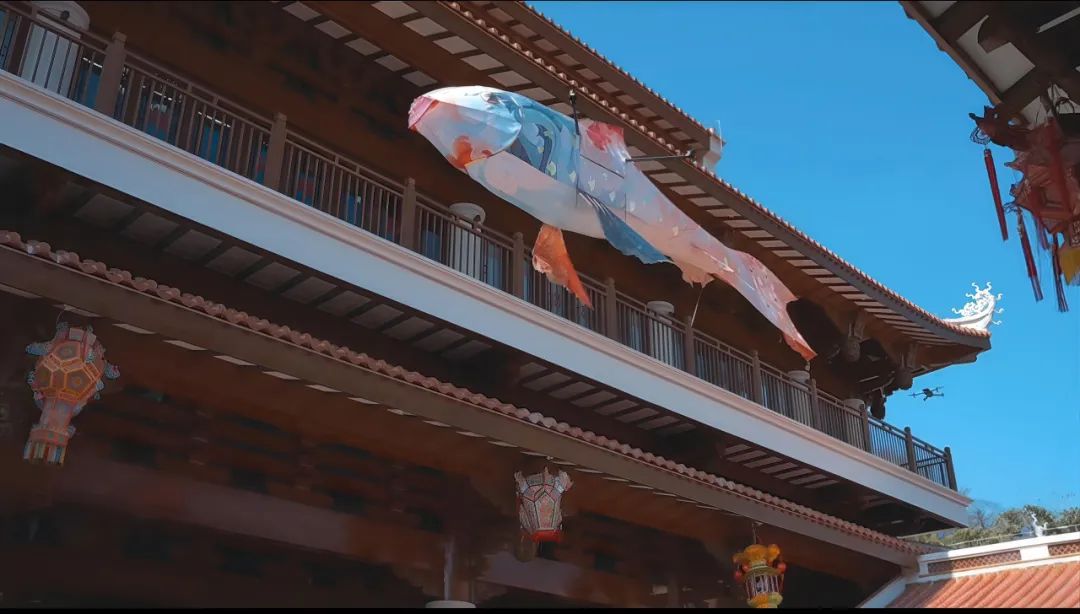 鲤鱼造型的非遗花灯飞跃魁星岩,是跨越非遗、魁星文化、现代无人机技术的多领域融合的创新表达
