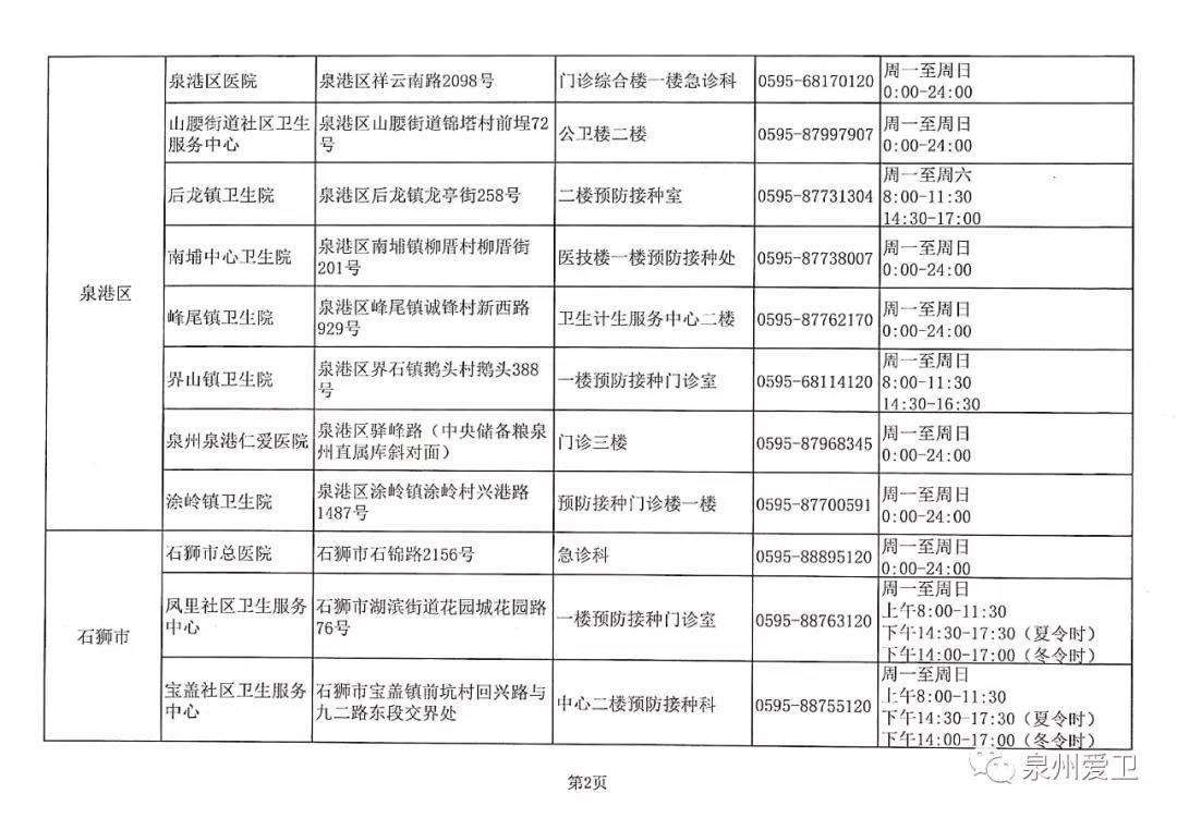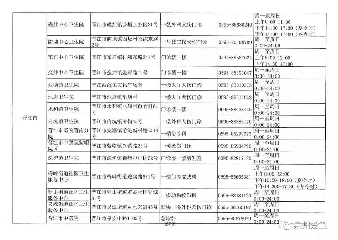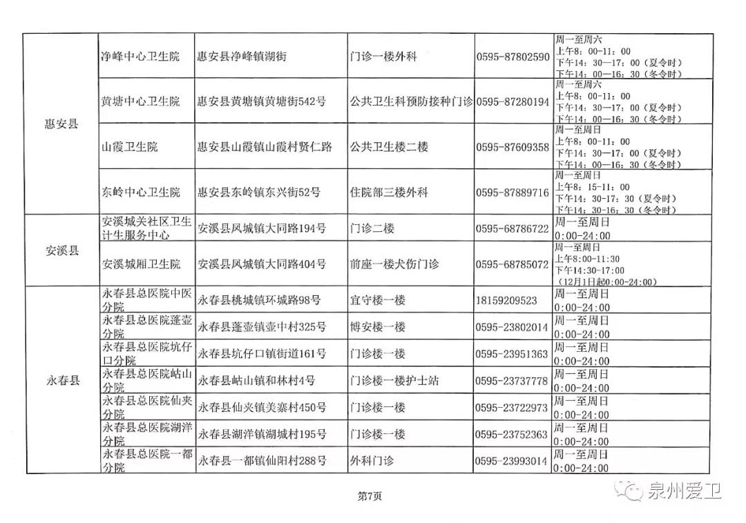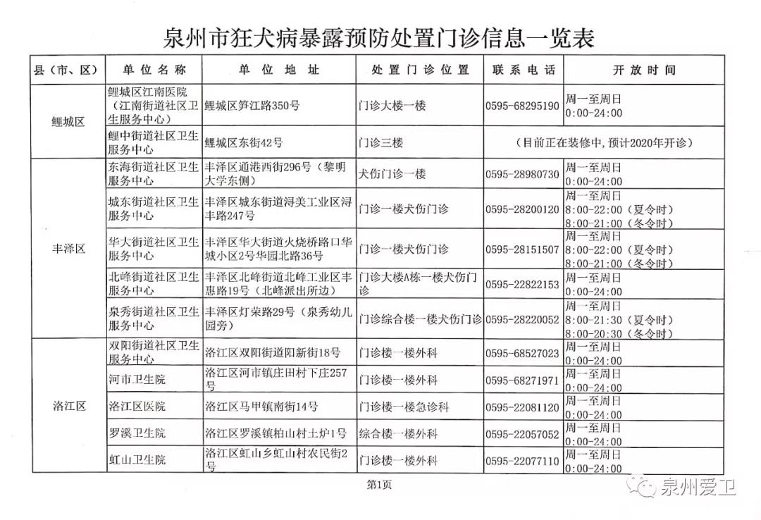泉州市狂犬病暴露预防处置门诊信息一览表