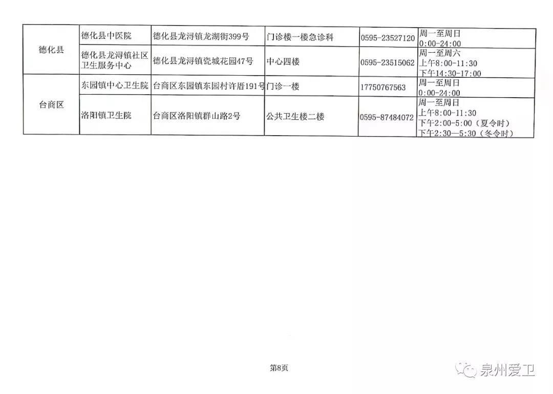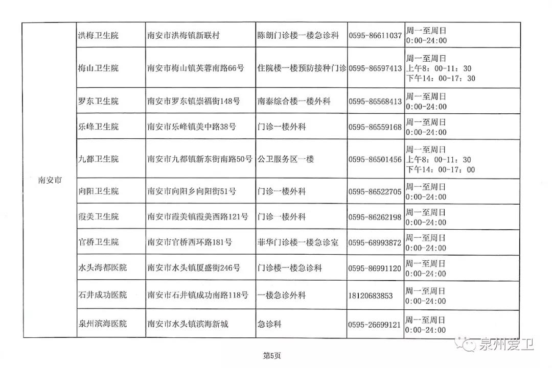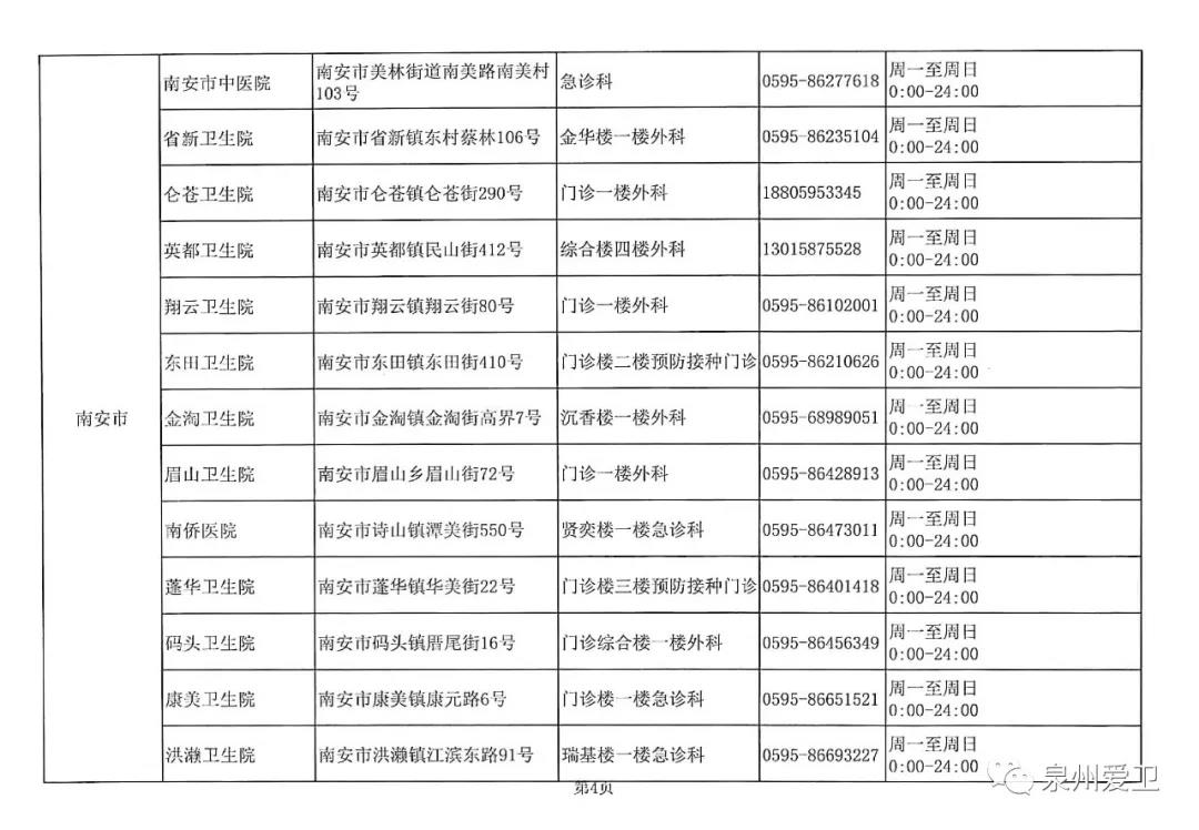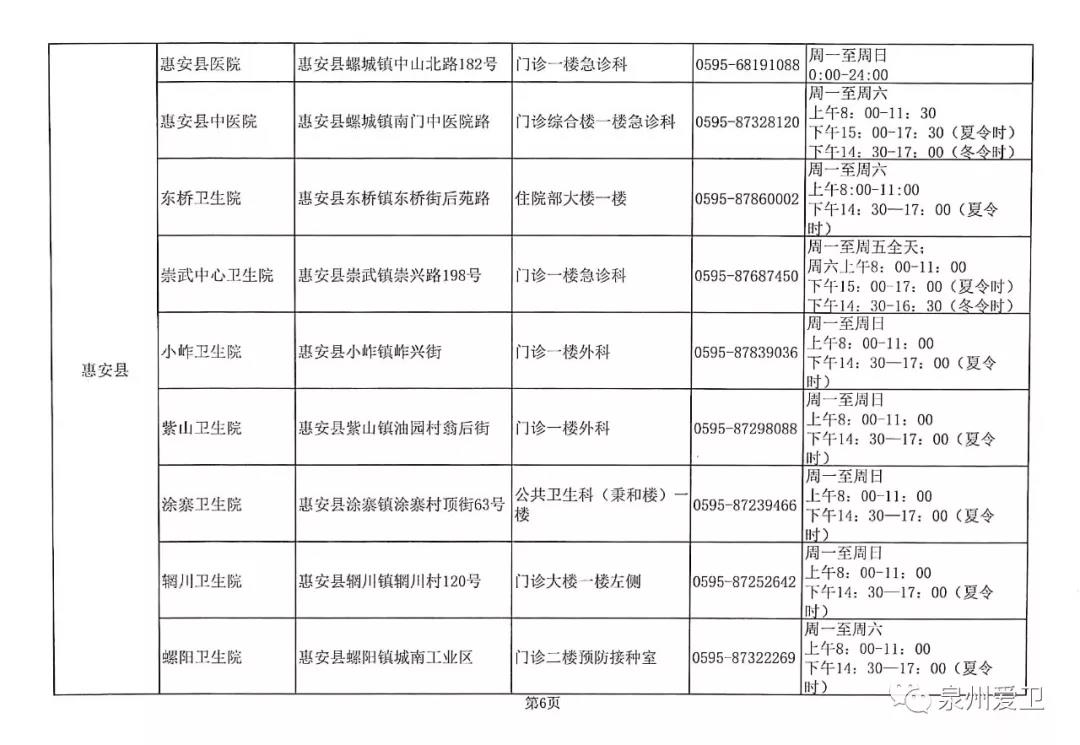 泉州市狂犬病暴露预防处置门诊信息一览表