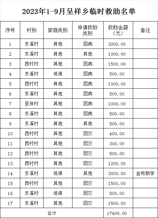 2023年1-9月呈祥乡临时救助名单